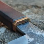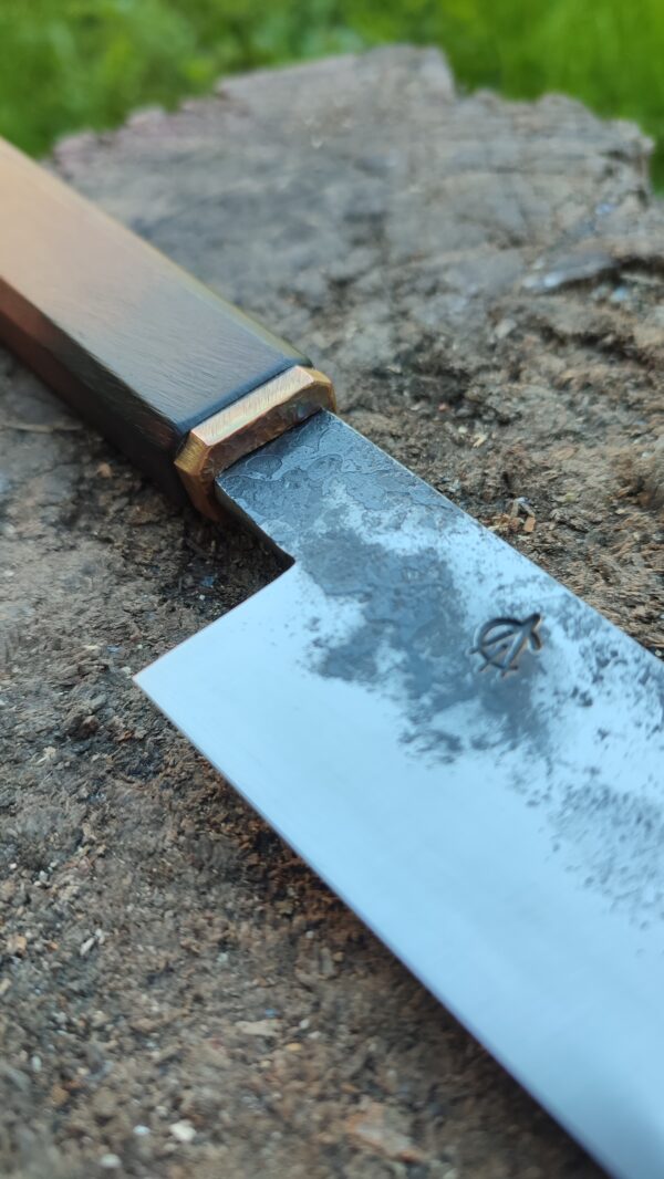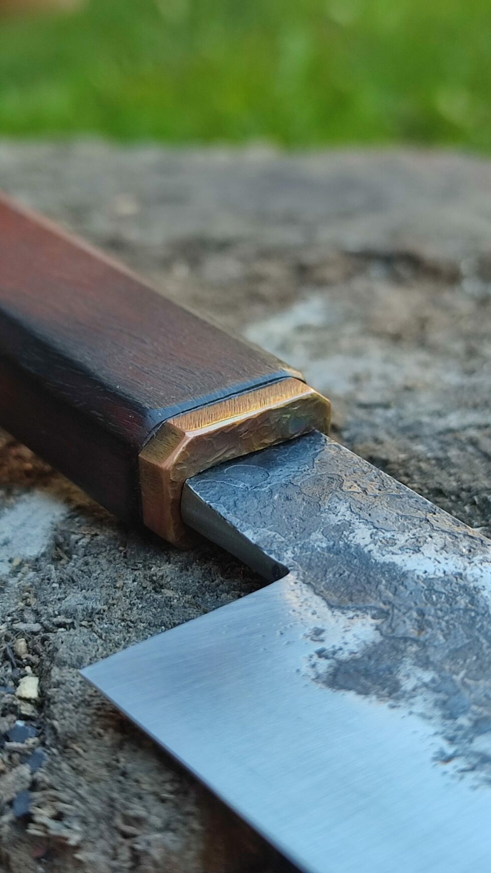Manche en bois de Cumaru brûlé avec platine cuivre texturée.